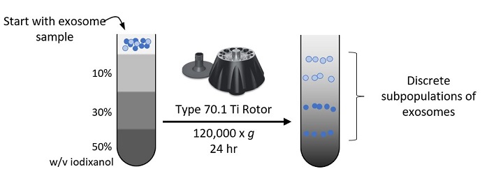 In rate zonal DGUC, a crude exosome sample is placed on top of a preformed linear density gradient. Upon spinning, the exosomes will sediment at different rates depending on their individual sedimentation coefficients.