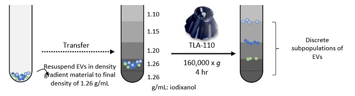 In equilibrium zonal DGUC, a crude exosome sample is placed in a tube with distinct steps of progressively higher densities. Upon spinning, the exosomes will migrate to the position in the tube equal to their buoyant density, typically at an interface between two steps. Much like isopycnic DGUC, there are many variations of this separation approach. In contrast to isopycnic DGUC, however, the experiment is stopped before a linear density gradient is formed (i.e., the distinct steps are maintained). In this specific example, the exosomes are pelleted in a previous step and resuspended directly into a buffered solution at a specific density, but this is not an absolute requirement.