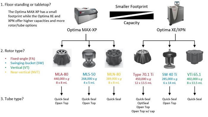 *The speed at which the run can be safely performed is dictated by the starting density and rotor. Please refer to the rotor instructions for use (IFU) to determine safe operating speeds when using dense materials. These are only recommended rotors and tubes – please see the Ultracentrifuge Catalog for a complete list of compatible rotors and tubes. Some tubes may require adapters to work with specific rotors.